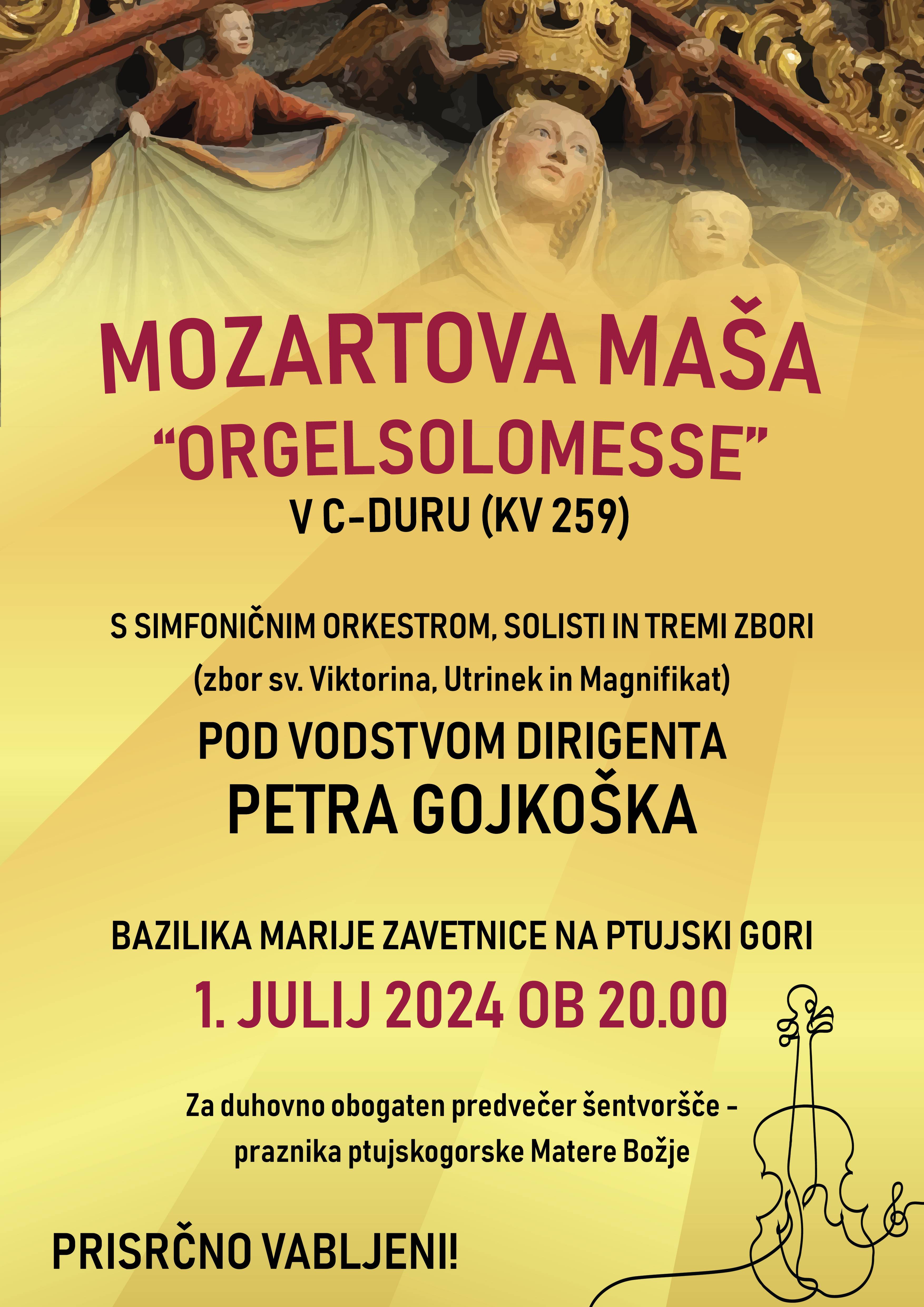 Mozartova maša v C-durus simfoničnim orkestrom, solisti in tremi zboripod vodstvom dirigenta Petra Gojkoškav baziliki Marije Zavetnice na Ptujski Gori1. julija 2024 ob 20.00 uri.plakat